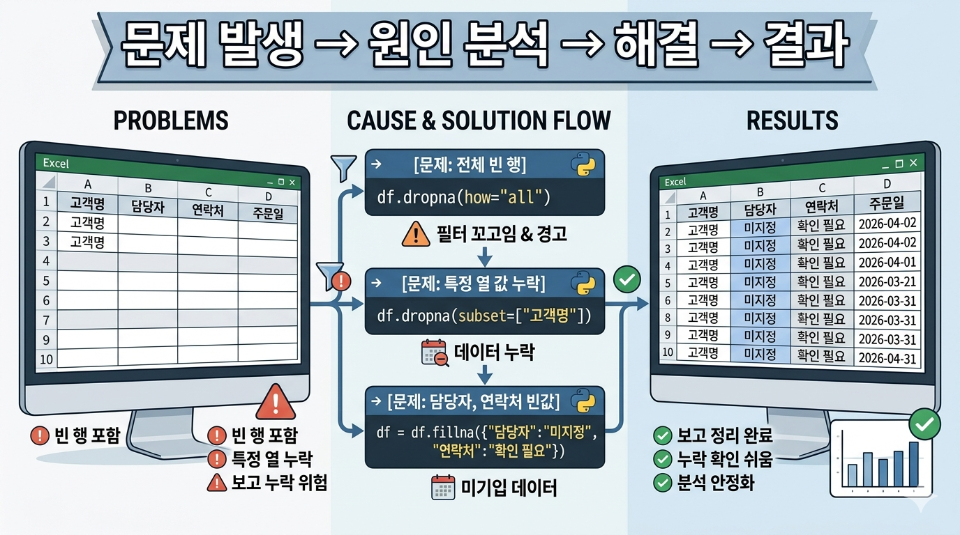 이 코드에서 먼저 봐야 할 것은 dropna(how="all")입니다. 이 구문은 한 줄 전체가 비어 있는 행만 삭제합니다. 실무 파일에는 중간중간 빈 줄이 끼어 있는 경우가 많은데, 이런 행을 먼저 제거해 주면 이후 정렬이나 집계가 훨씬 깔끔해집니다. 그다음 dropna(subset=["고객명"])은 특정 열을 기준으로 빈칸을 제거하는 방식입니다. 즉, 고객명이 없는 데이터는 핵심 정보가 빠졌다고 판단하고 제외하는 흐름입니다. 이 부분은 파일마다 기준 열 이름만 바꾸면 바로 응용할 수 있습니다.