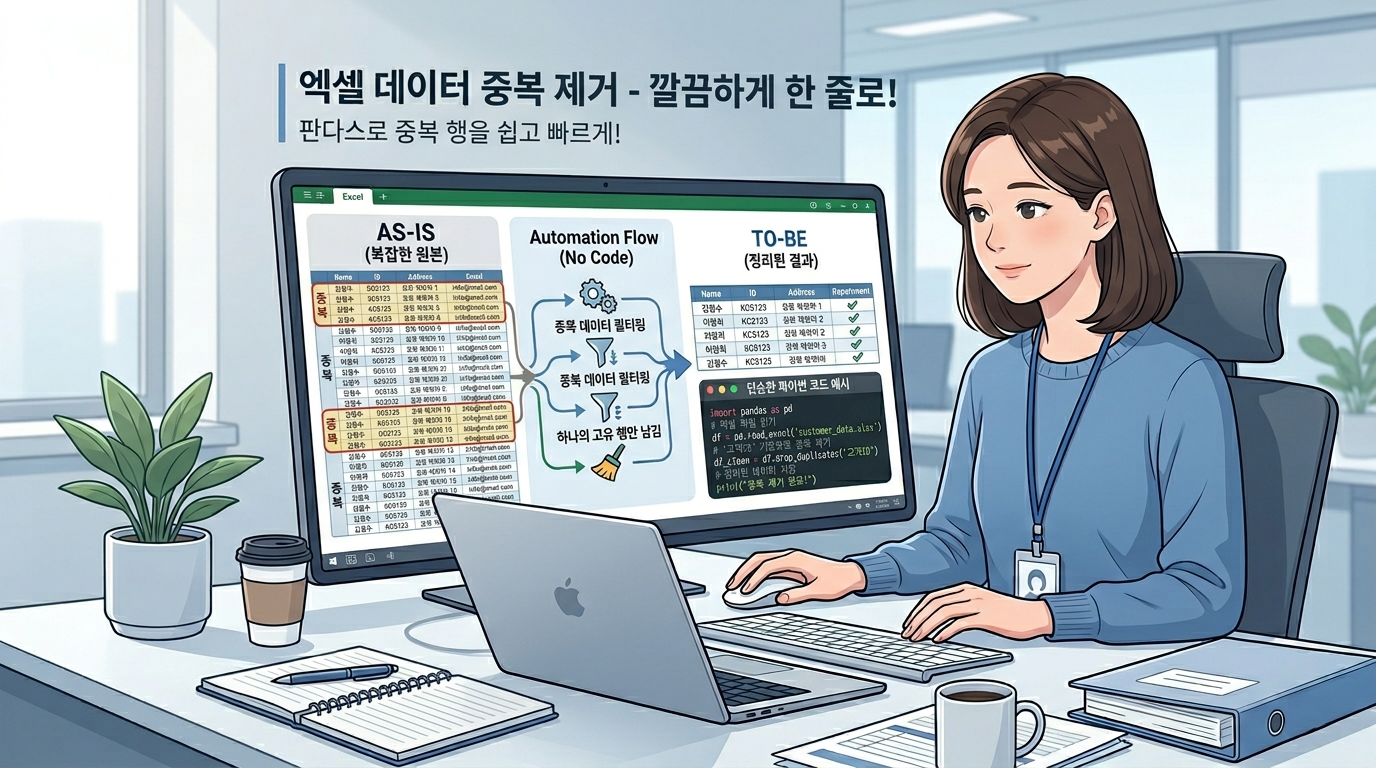 엑셀 파일을 정리하다 보면 같은 데이터가 여러 번 들어가 있는 경우를 자주 보게 됩니다. 처음에는 눈에 잘 띄지 않지만, 중복된 행이 쌓이면 집계가 달라지고 보고서도 부정확해질 수 있습니다. 이 글에서는 파이썬으로 엑셀 중복 데이터를 정리하는 가장 기본적인 방법을 쉽게 이해할 수 있게 설명해보겠습니다.