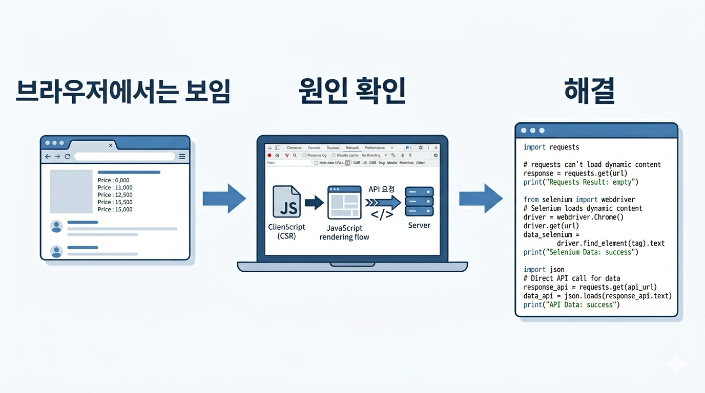크롤링을 하다 보면 브라우저에서는 분명 값이 보이는데, requests로 가져오면 빈 결과만 나오는 순간이 있습니다. 저도 처음에는 선택자를 잘못 적은 줄 알았지만, 실제 원인은 페이지가 처음부터 HTML에 데이터를 담고 있지 않고 JavaScript 실행 이후에 값을 만들어 붙이는 구조였습니다. 이번 글에서는 제가 직접 겪은 흐름대로, 왜 브라우저에서는 보이는데 코드에서는 안 보였는지 확인하고, 언제 requests를 유지하고 언제 Selenium으로 바꿔야 하는지 정리하겠습니다.