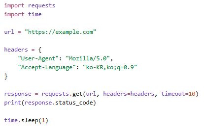 가장 먼저 적용한 방법은 User-Agent 설정이었습니다. 처음에는 이 한 줄이 정말 차이를 만들까 싶었지만, 실제로는 생각보다 효과가 있었습니다. User-Agent는 서버에 “어떤 환경에서 요청을 보내는가”를 알려주는 정보입니다. 브라우저는 이 값을 자연스럽게 포함해서 요청하지만, 단순한 코드 요청은 상대적으로 비어 있게 보일 수 있습니다. 그래서 requests를 사용할 때 최소한의 헤더를 직접 넣어 주는 것만으로도 응답 상태가 달라질 수 있습니다.